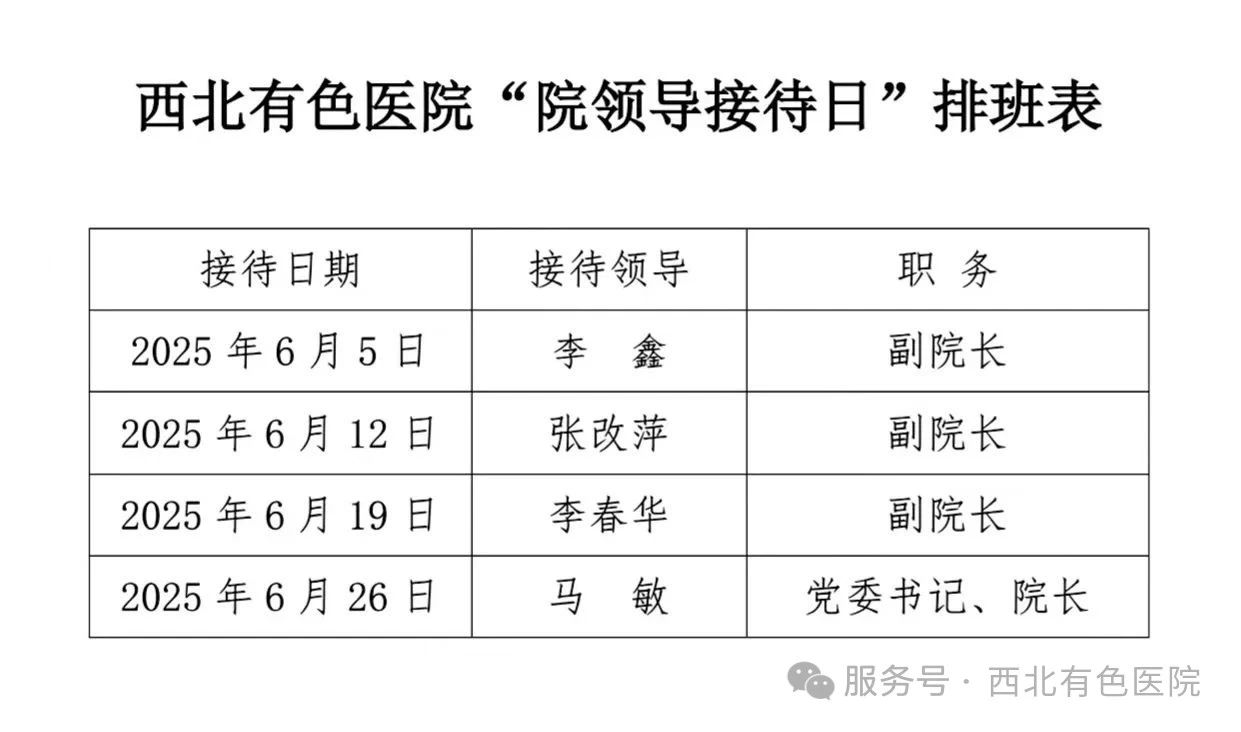 为进一步提升医疗质量、医疗安全和服务效率,持续推进各项惠民措施落地,认真听取广大患者及家属、医院职工、社会各界人士对医院的意见与建议,加强医院与患者的沟通联系,充分维护医患双方的合法权益,构建和谐融洽的医患关系,不断改善群众就医体验,现将2025年5月医院“院领导接待日”相关事宜通知如下: